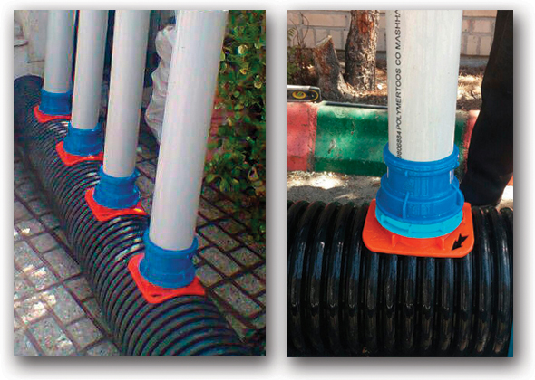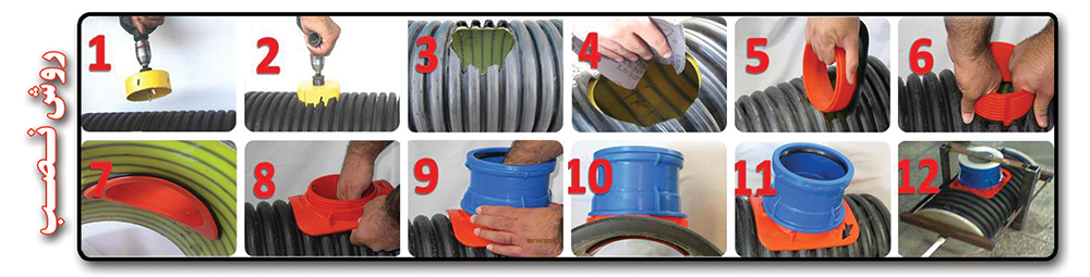 (أ) ارتفاع المطاط المرتفع لتغطية المساحة الفارغة خلف الجسم مع السطح المقطوع للأنبوب المزدوج الجدران ، الذي بالإضافة إلى مزید من منع تسرب الماء، يسبب المزيد من تمسک و جذب الجسم على الأنبوب ولا يسقط في نظام الصرف الصحي أثناء التجميع ويمنع تسلل جذورالأشجار إلى شبكة الصرف الصحي.